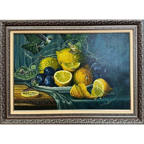 Картина маслом "Натюрморт с лимонами и лягушкой"