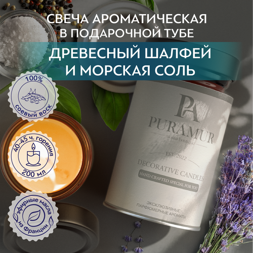 Свеча ароматическая PURAMUR в подарочной тубе 200мл Древесный шалфей и морская соль