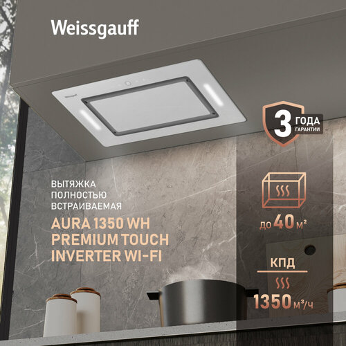 Кухонная встраиваемая вытяжка с Wi-Fi и инвертором Weissgauff Aura 1350 WH Premium Touch Inverter Wi-Fi 3 года гарантии, Алюминиевый жировой фильтр, Низкий уровень шума