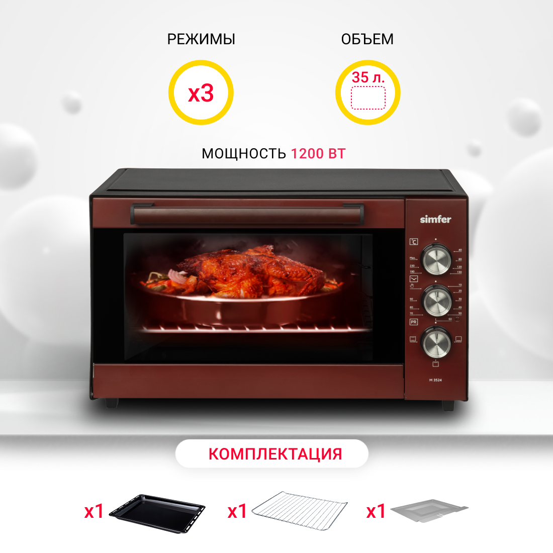 Настольная электродуховка M3427 выпускается известной компанией из Турции Simfer в модельной линейке ALBENI. Как большая часть бытовой техники этого бренда, электрическая мини-печь выступает полноценным ростером. Другими словами, позволяет готовить практически любые блюда при вполне компактных размерах: габариты изделия – 48*33*36,6 мм; масса – 8,8 кг; вместимость камеры – 34 литра. Многофункциональность настольной духовки достигается за счет трех режимов приготовления, которые различаются способом нагрева: верхний; нижний; комбинация верхнего и нижнего; Удобная панель управления. Обеспечивает быстрый выбор и установку трех базовых параметров готовки – режима, температуры и времени. Дополняется таймером и функцией автоотключения при перегреве. Дверца из закаленного стекла. Позволяет визуально контролировать качество приготовления. Изготовление ножек из резины. Исключает скольжение или неустойчивость мини-печи. Надежная теплозащита ручки, корпуса и ножек бытового устройства. Сводит к минимуму риск ожога и тепл