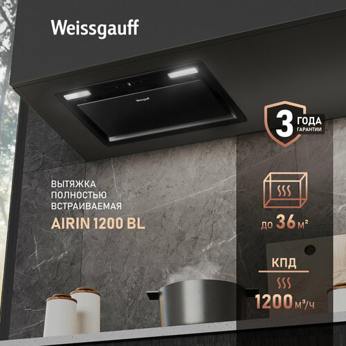 Кухонная встраиваемая вытяжка Weissgauff Airin 1200 BL 3 года гарантии, Алюминиевый жировой фильтр, Низкий уровень шума