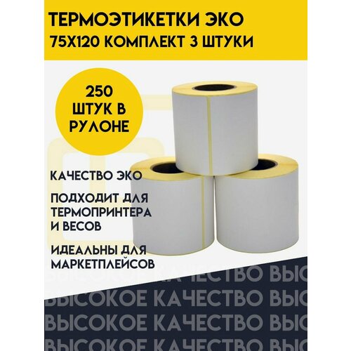 Термоэтикетки самоклеющиеся 75x120 мм, 3 рулона, 250 шт