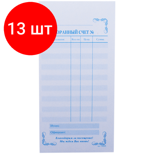 Комплект 13 шт, Бланк самокопирующийся "Ресторанный счет" OfficeSpace, 97*200мм, 2-слойный, 50 экз, цветной