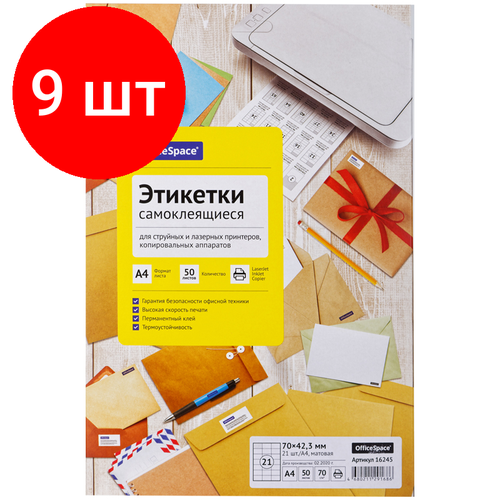 Комплект 9 шт, Этикетки самоклеящиеся А4 50л. OfficeSpace, белые, 21 фр. (70*42.3), 70г/м2