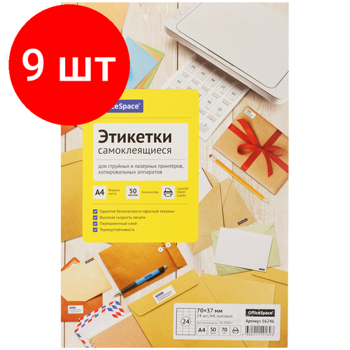 Комплект 9 шт, Этикетки самоклеящиеся А4 50л. OfficeSpace, белые, 24 фр. (70*37), 70г/м2