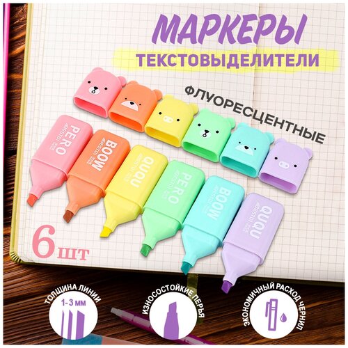 Текстовыделитель мини зверьки 6 штук в наборе пастельные цвета / Набор маркеров
