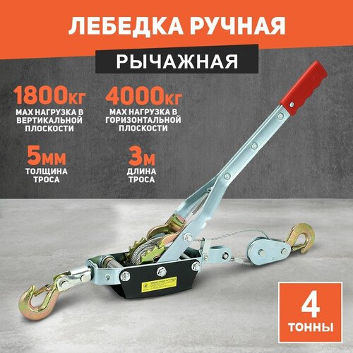 Лебедка ручная рычажная автомобильная 4 тонны (длина троса 3,0м/5мм) переносная с двойным храповым механизмом
