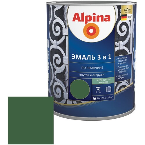 Эмаль по ржавчине Alpina зеленая RAL 6002 3в1 шелковисто-матовая 0,75 л