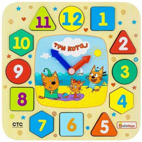 Обучающие детские часы "Три кота" с цифрами - вкладышами, развивающая игрушка сортер по методике Монтессори