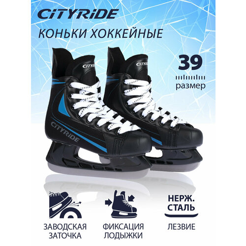 Хоккейные коньки ТМ City-Ride, лезвия нержавеющая сталь/заводская заточка, ботинки нейлон/ПВХ, чёрный/синий, 40(RUS39)