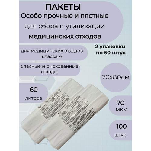 Пакеты для медицинских отходов класса А,90*130,100мкм. белые-50шт.