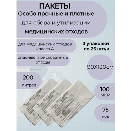 Пакеты для медицинских отходов класса А,90*130,100мкм. белые-75шт.