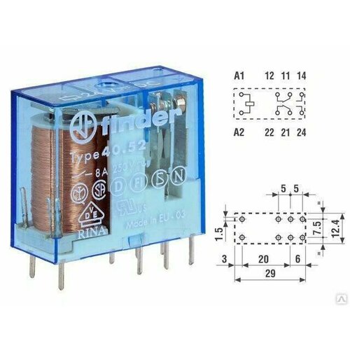 FINDER Реле миниатюрное РСВ выводы 5мм 2 контакта 8А DC 12В AgN FINDER 405290120000