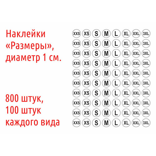 Наклейки "Размерники XS S M L XL XXL", 1 см, 800 штук.