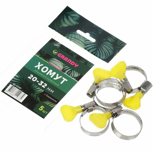 Хомут обжимной червячный с барашком, 20-32 мм, нержавеющая сталь, 5 шт, индивидуальная упаковка, Grandy