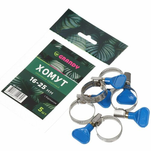 Хомут обжимной червячный с барашком, 16-25 мм, нержавеющая сталь, 5 шт, индивидуальная упаковка, Grandy