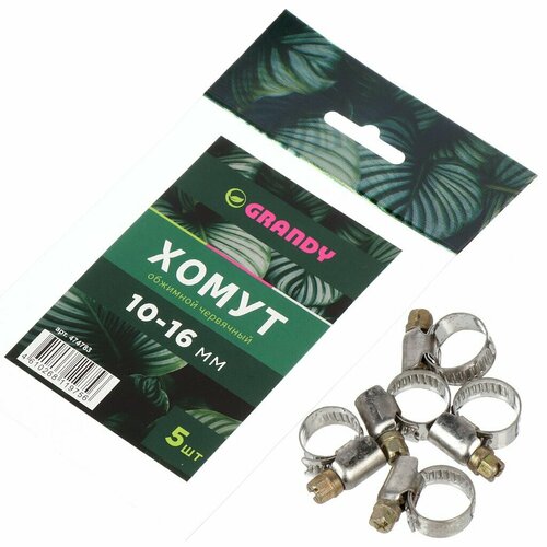 Хомут обжимной червячный, 10-16 мм, нержавеющая сталь, 5 шт, индивидуальная упаковка, Grandy