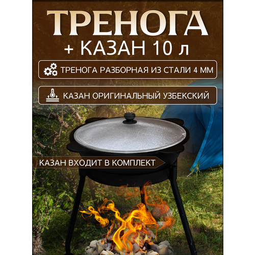 Казан чугунный с крышкой 10 литров + тренога для костра (тренога для казана)