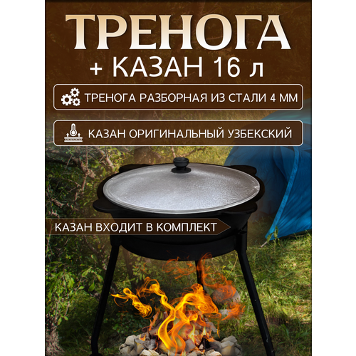 Казан чугунный с крышкой 16 литров + тренога для костра (тренога для казана)