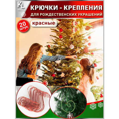 KoLeli / Крючки "Завиток" для елочных игрушек, красные крепления для новогодних шаров, 20 шт.
