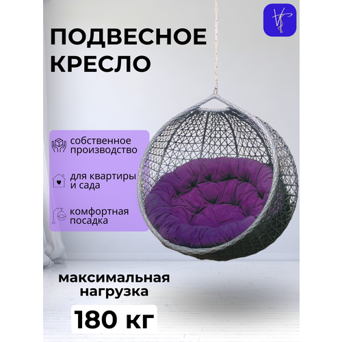 Подвесное кресло садовое, снежка без стойки, серая, сиреневая подушка