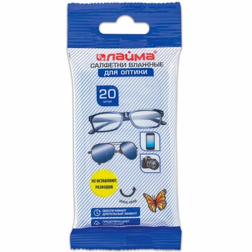 Салфетки влажные для очков и оптики, смартфоны, объективы, Laima, компактные, 20 шт,605661