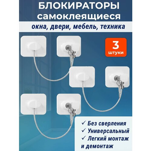 Лот 3 шт: Блокиратор усиленный на окно, дверь, самоклеящийся с тросиком