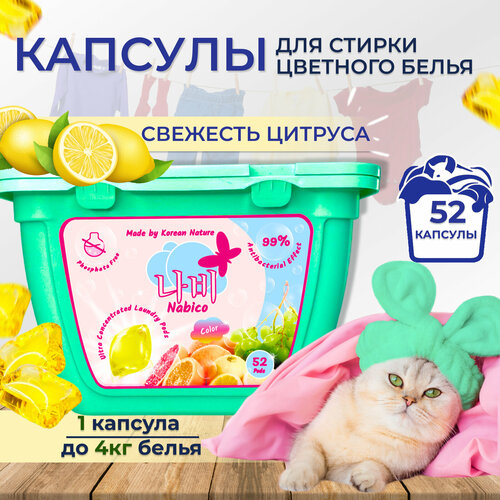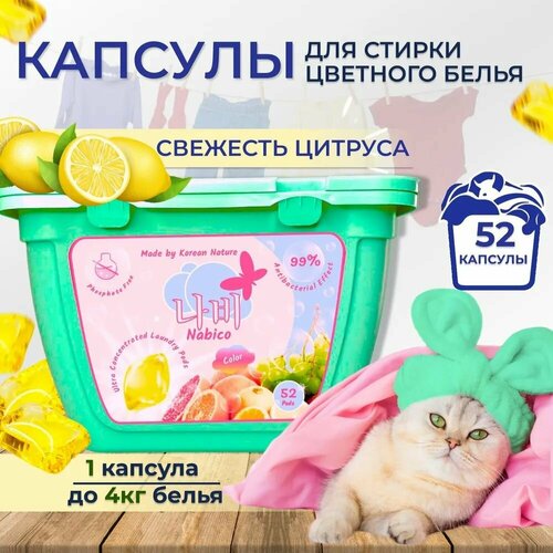 Капсулы для стирки 3в1 Nabico, концентрат с кондиционером для цветного белья, защита цвета с антибактериальным эффектом против пятен, аромат цитрус