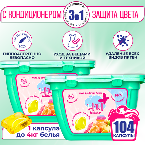 Капсулы для стирки с кондиционером 3в1 Nabico, концентрат против пятен, защита цвета, для цветного, белого, чёрного белья, белья, 104 шт.
