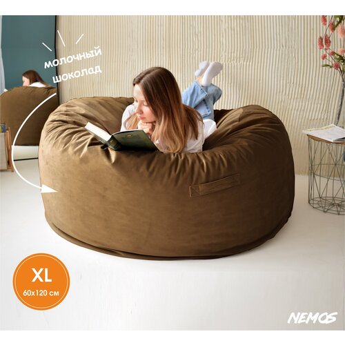 Огромный, большой, бескаркасный пуф из натурального велюра премиум качества Nemos. Кресло-мешок, пуфик размера XL, Коричневый