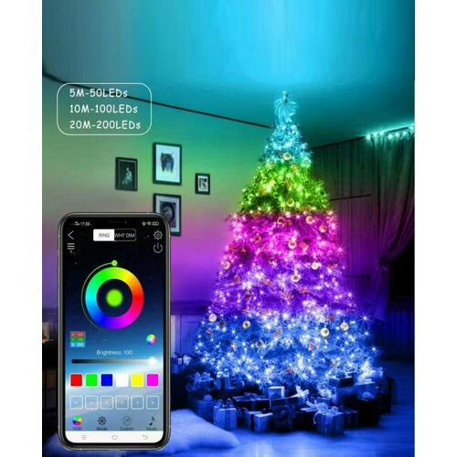 Гирлянда новогодняя светодиодная RGB управление со смартфона, для елки украшения для дома, 10 метров 100 лампочек