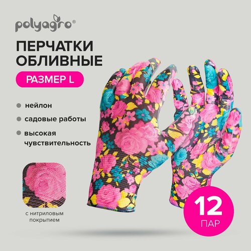 Перчатки хозяйственые садовые нейлоновые нитриловый облив, размер L, 12 пар Polyagro