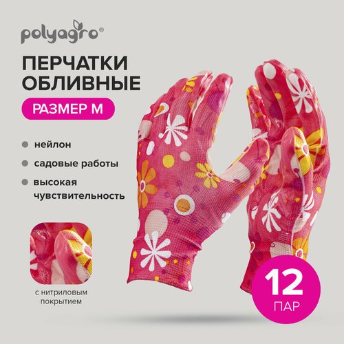 Перчатки хозяйственые садовые нейлоновые нитриловый облив, размер M, 12 пар Polyagro