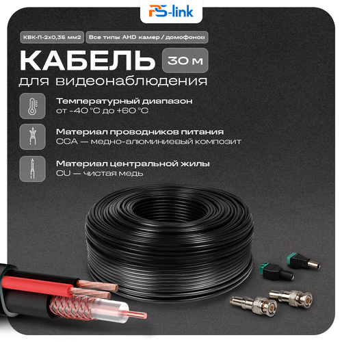 Кабель КВК RG-59 + 2 x 0.35 кв. мм. 30м. Ps-Link KVK-CCA-2035K-30
