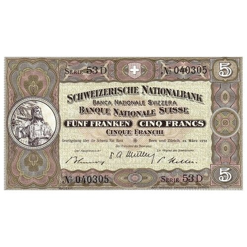 Швейцария 5 франков 1952 г. Вильгельм Телль UNC Достаточно редкая!