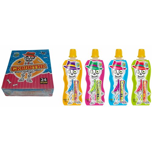 Конфета жидкая скелетик, 24шт по 18г, в тюбике, со вкусом колы, апельсина, вишни, клубники, скиф