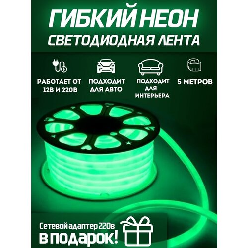 Светодиодная лента SmartElectronics 5м, 220В, IP67, 120 LED/m Гибкий неон 5 метров, неоновая RGB лента, подсветка интерьера/Зеленый