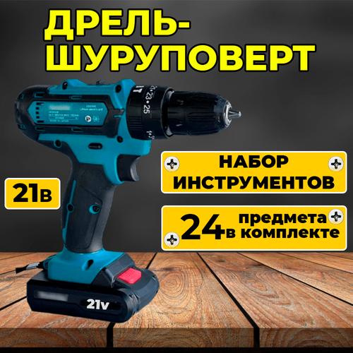 Аккумуляторная дрель-шуруповёрт 21V с набором и кейсом, 2 аккумулятора