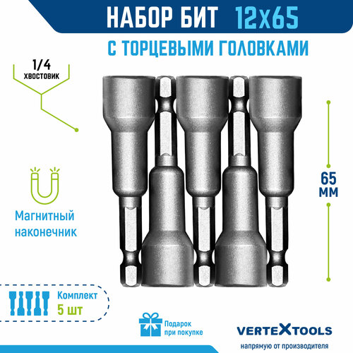 Биты с магнитными торцевыми головками VertexTools 12x65, 5 шт.