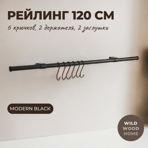 Рейлинг для кухни 1200 мм, набор "Modern Black" с 6 крючками, держателем и заглушками, Wild Wood