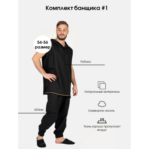 Комплект банщика Woodson из льна черного цвета с цветной полосой, в комплекте рубаха и штаны, 54-56р / Одежда для бани