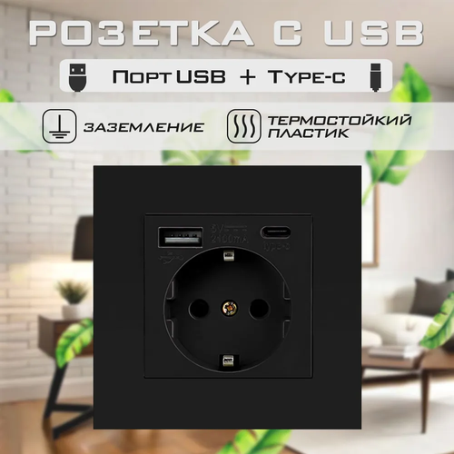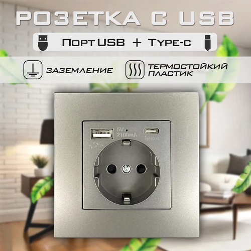 Розетка с USB портами Type-C и Type-A 220В с заземлением