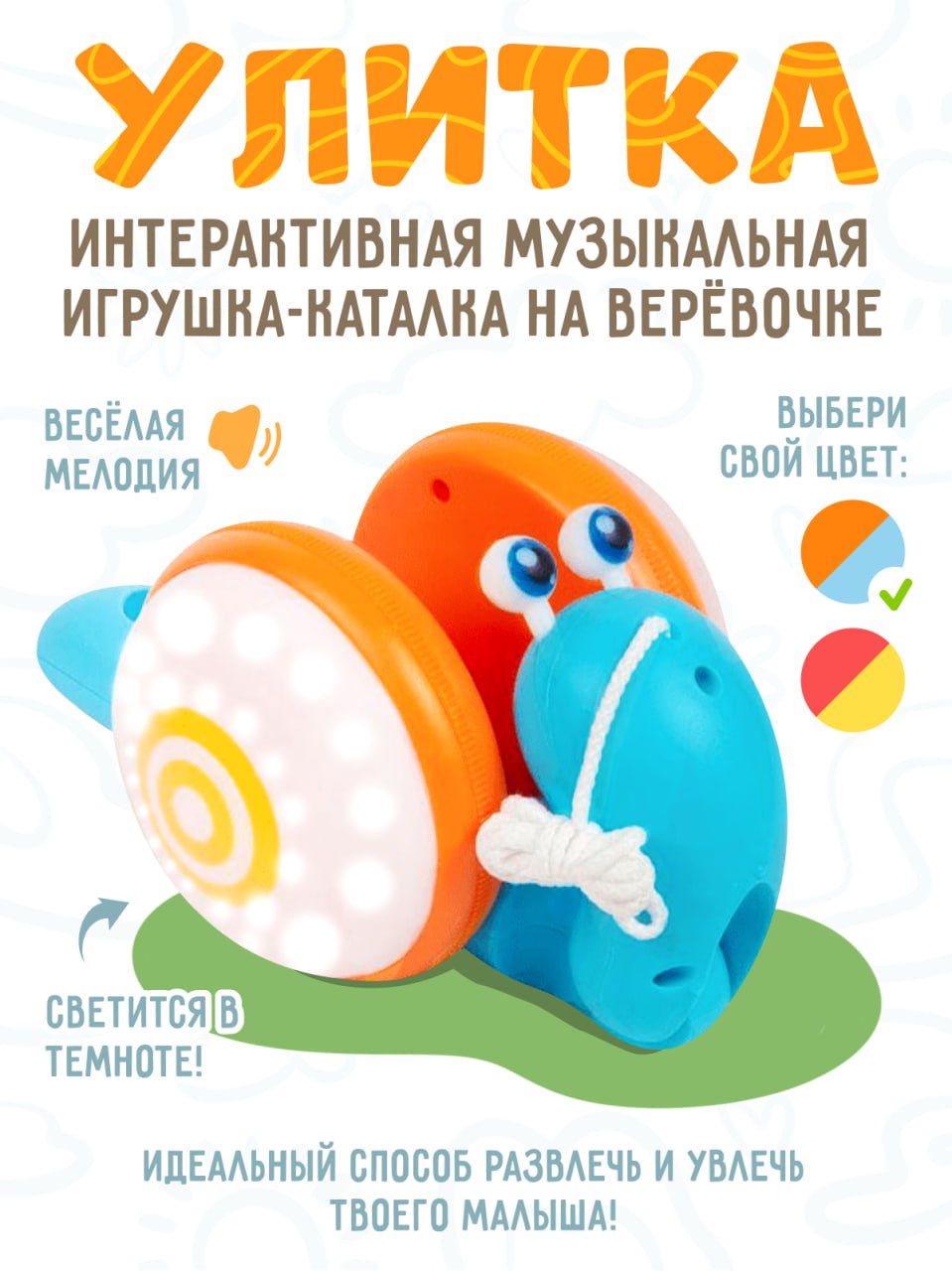 Интерактивная музыкальная игрушка - Улитка, ночной светильник, оранжевый с синим 600013056722