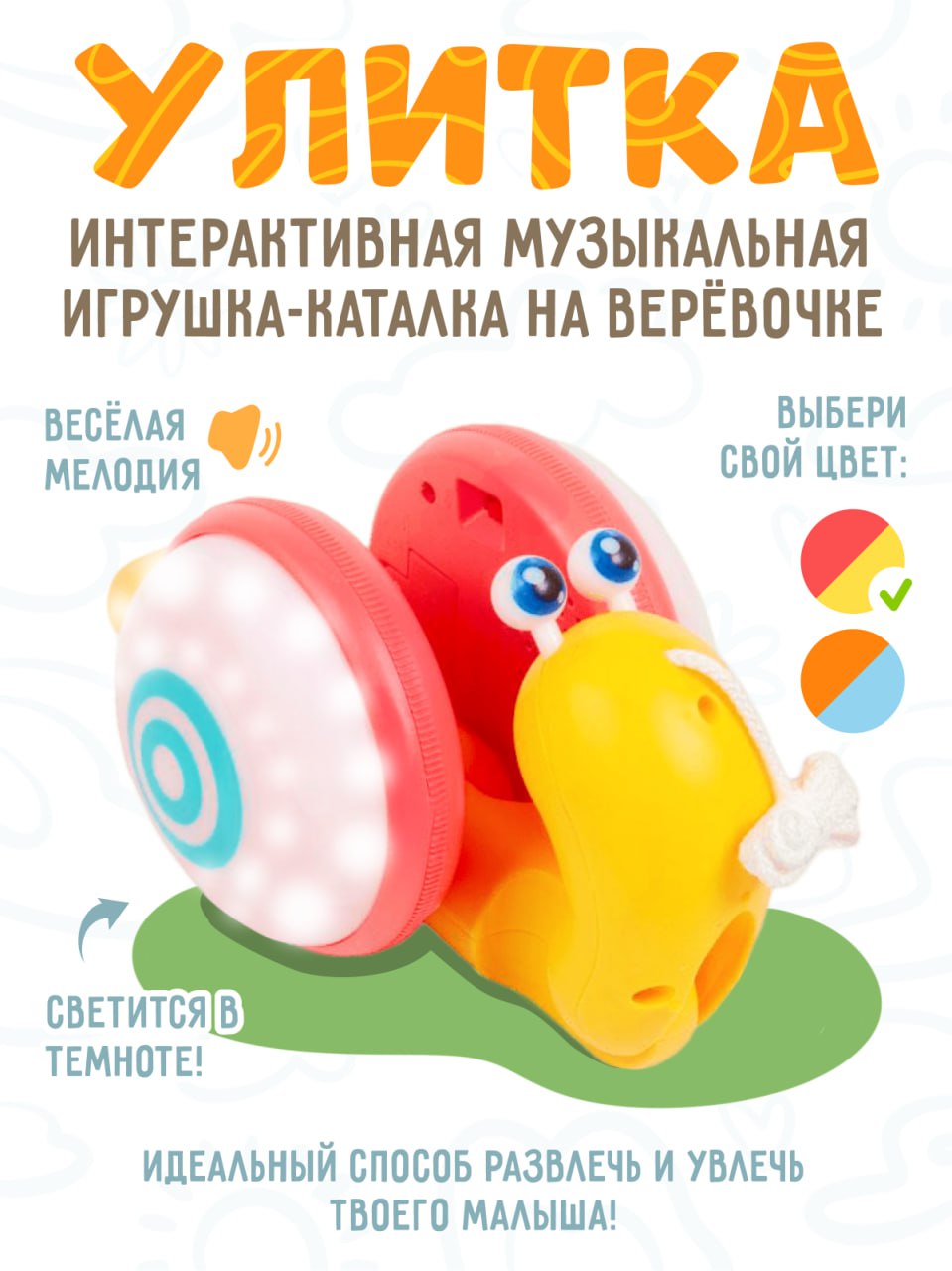 Интерактивная музыкальная игрушка - Улитка, ночной светильник, красный с желтым 600013056723