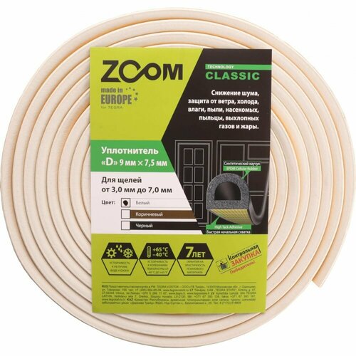 Самоклеящийся уплотнитель ZOOM Classic D (9х7.5 мм; белый; 10 м) 02-2-4-151