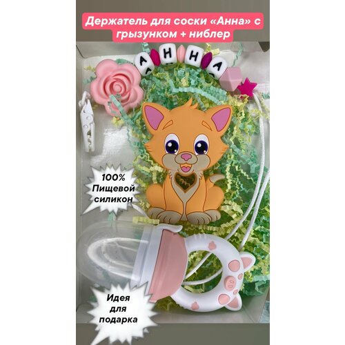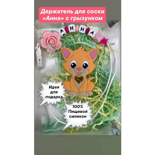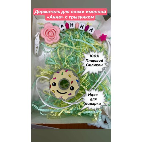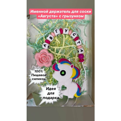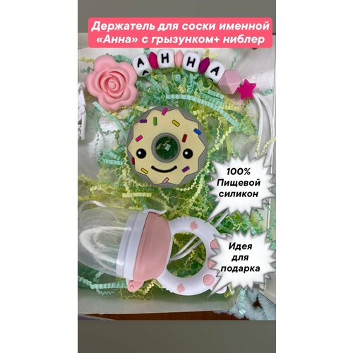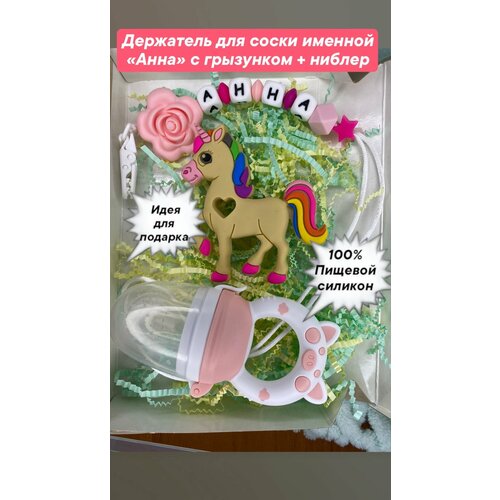 Именной держатель для соски - пустышки с именем полезный подарок для маленькой принцессы. Держатель выполняет функцию первой игрушки малыша, а так же служит прорезывателем для зубов. Это отличный подарок на выписку из роддома, на рождение ребенка, крещение или новый год. Именной грузунок оформлен в подарочную упаковку благодаря этому Вам не придется задумываться над упаковкой для подарка для малыша и его родителей. Материал держателя изготовлен из 100% пищевого силикона, он безопасен для детей и не токсичен. В качестве дополнительного украшения именного держателя используются разнообразные бусины, фигурки и прочие материалы.основные преимущества:✔