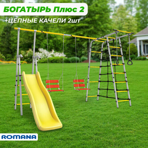 Уличный детский спортивный комплекс Romana Богатырь Плюс-2 с цепными качелями (2 шт) и горкой, серо-желто-красный