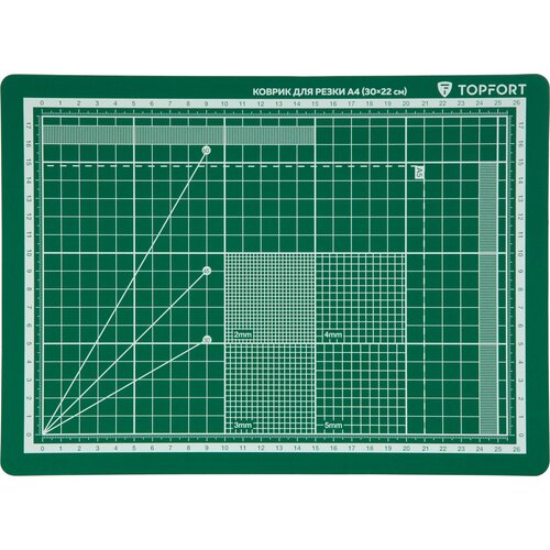 зеленыйВнимание! Товар продается комплектом:[Коврик для резки TOPFORT 3х-слойный А4 (30х22см),2х-сторонний,зеленый] X 5 шт. Профессиональный высококачественный двухсторонний коврик (мат) для резки Topfort состоит из трехслойной структуры ПВХ толщиной 3 мм. Верхний и нижний слои мягкие, самовосстанавливающиеся. Это позволяет сохранить лезвия ножей острыми и обеспечивает плавный и легкий ход ножа. Средний слой плотный. Он дополнительно защищает поверхность стола от порезов. Изделие предназначено для защиты стола и прочих рабочих поверхностей при резке различных материалов: ткань, бумага, картон, кожа, пластик. Он станет незаменимым помощником во время занятий такими видами творчества как квиллинг, скрапбукинг, пэчворк, моделирование, аппликация, коллаж. Коврик можно применять везде, где используется макетный, раскройный нож или скальпель. Светло-зеленая матовая поверхность не создает бликов и снижает нагрузку на глаза при продолжительной работе. С каждой стороны имеется специальная разметка-сетка (единицы измерения: с