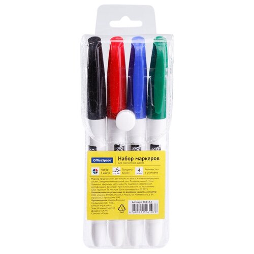 288142 Набор маркеров для белых досок OfficeSpace 4цв, пулевидный, 3мм, чехол с европодвесом