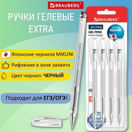 Гелевые ручки BRAUBERG "EXTRA", черные, набор 4 штуки, узел 0,5 мм, линия 0,35 мм, 143906
